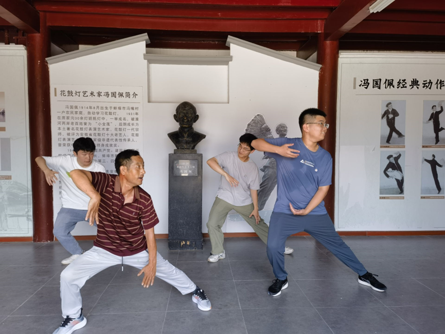 8日,实践团成员来到了蚌埠市禹会区冯嘴村,与非遗传承人冯开苗进行深入交谈,并参观了冯派花鼓纪念堂。在冯国报和冯开苗老师的表演中,我队成员观赏并学习了冯派花鼓舞蹈的基本动作,如摘仙桃、小二姐踢球、野鸡溜等,实现了从“旁观者”到“参与者”的转变。冯老师告诉我们:“在淮河流域,大家是一边干农活一边交谈,聚在一起打锣鼓,逐渐孕育了花鼓灯艺术,”这些无不彰显着蚌埠人民在长期的生活劳作中吃苦耐劳、积极乐观的进取精神。